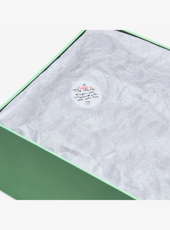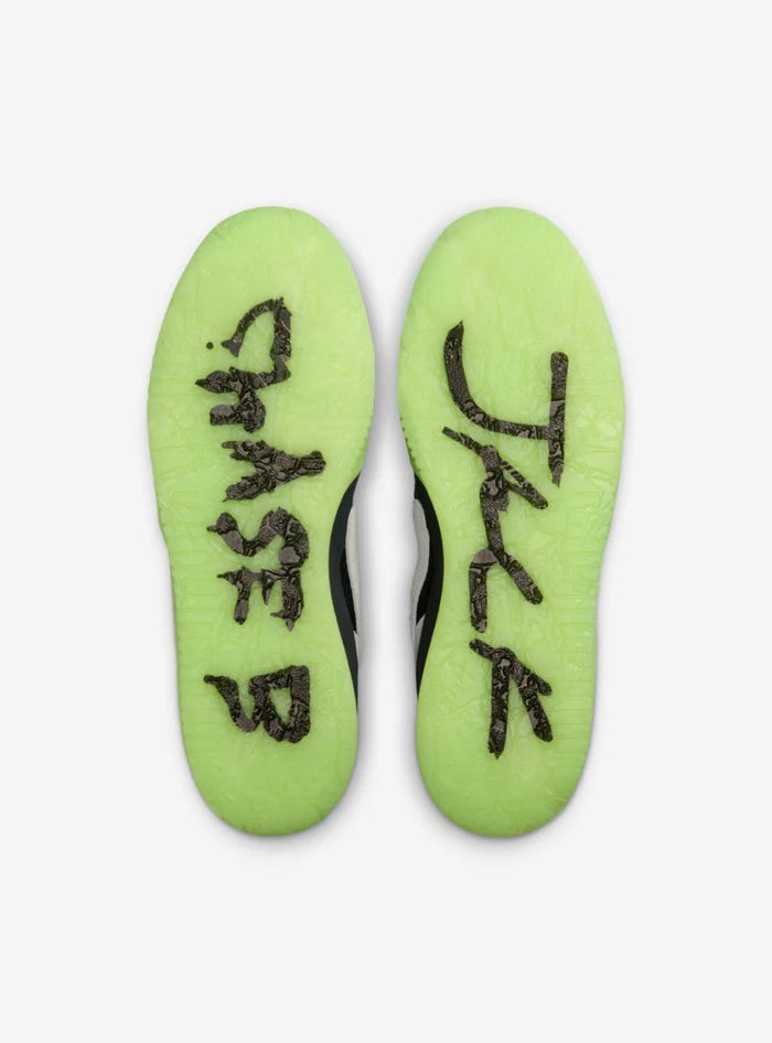Un elemento distintivo è la suola in gomma Illusion Green con effetto glow-in-the-dark, che crea un contrasto sorprendente e dona un forte impatto visivo anche al buio.